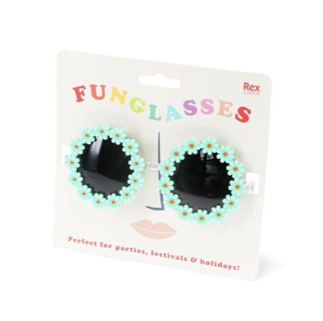 Une paire de lunettes de soleil fantaisie, comprenant une monture transparente et des verres circulaires teintés foncés, entourés de marguerites vertes.    Ajoutez une touche de plaisir et de couleur aux fêtes, festivals et vacances !